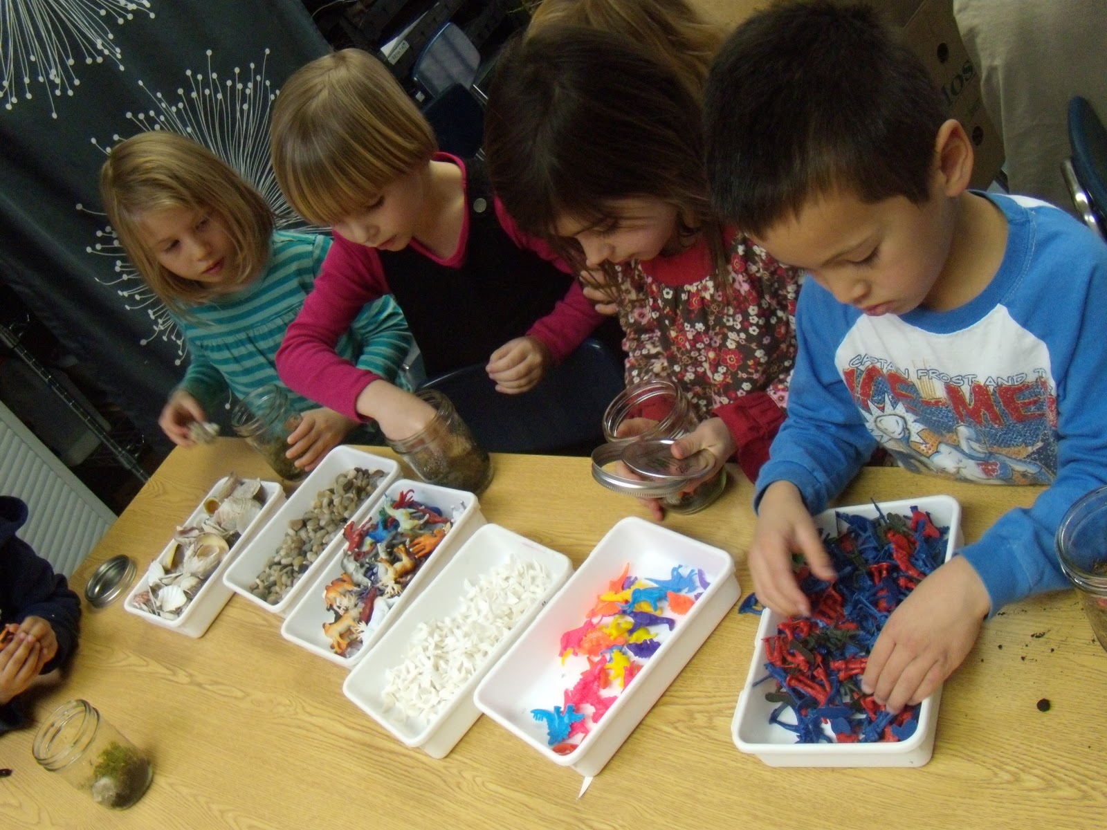 Day1: We put soil, moss, water, and accessories into mason jars. After they were done, we drew pictures of our terrariums and then a 'walking gallery tour' of the room.